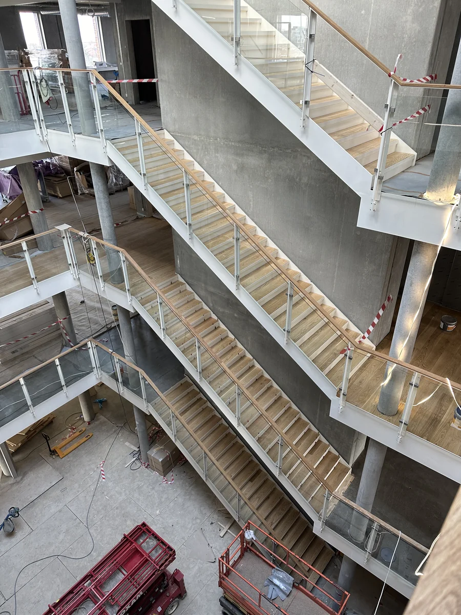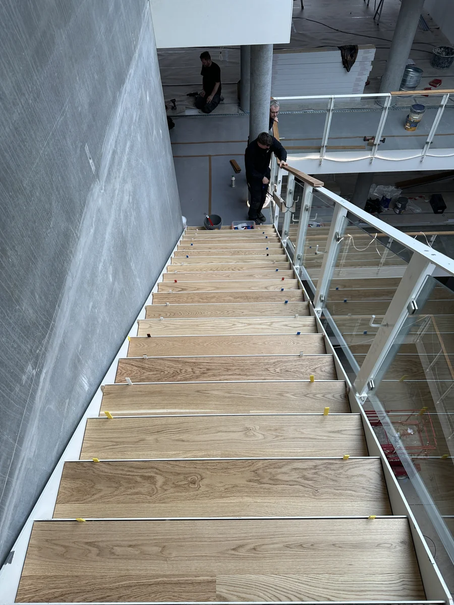 Udførelse af fuldlimenede tregulv og trappetrin i kontorbygning.