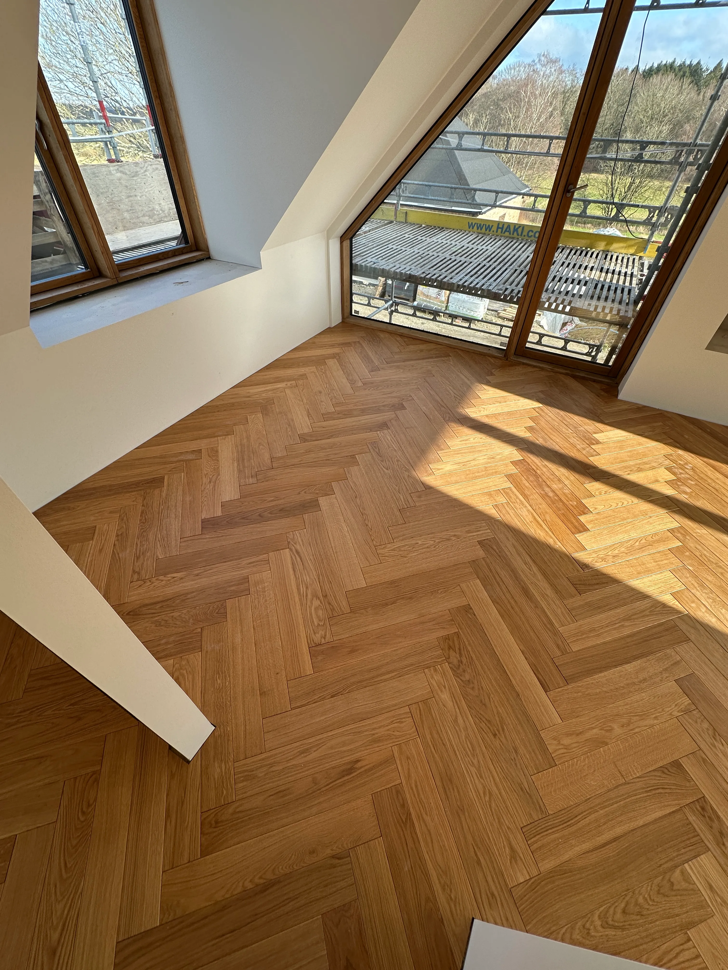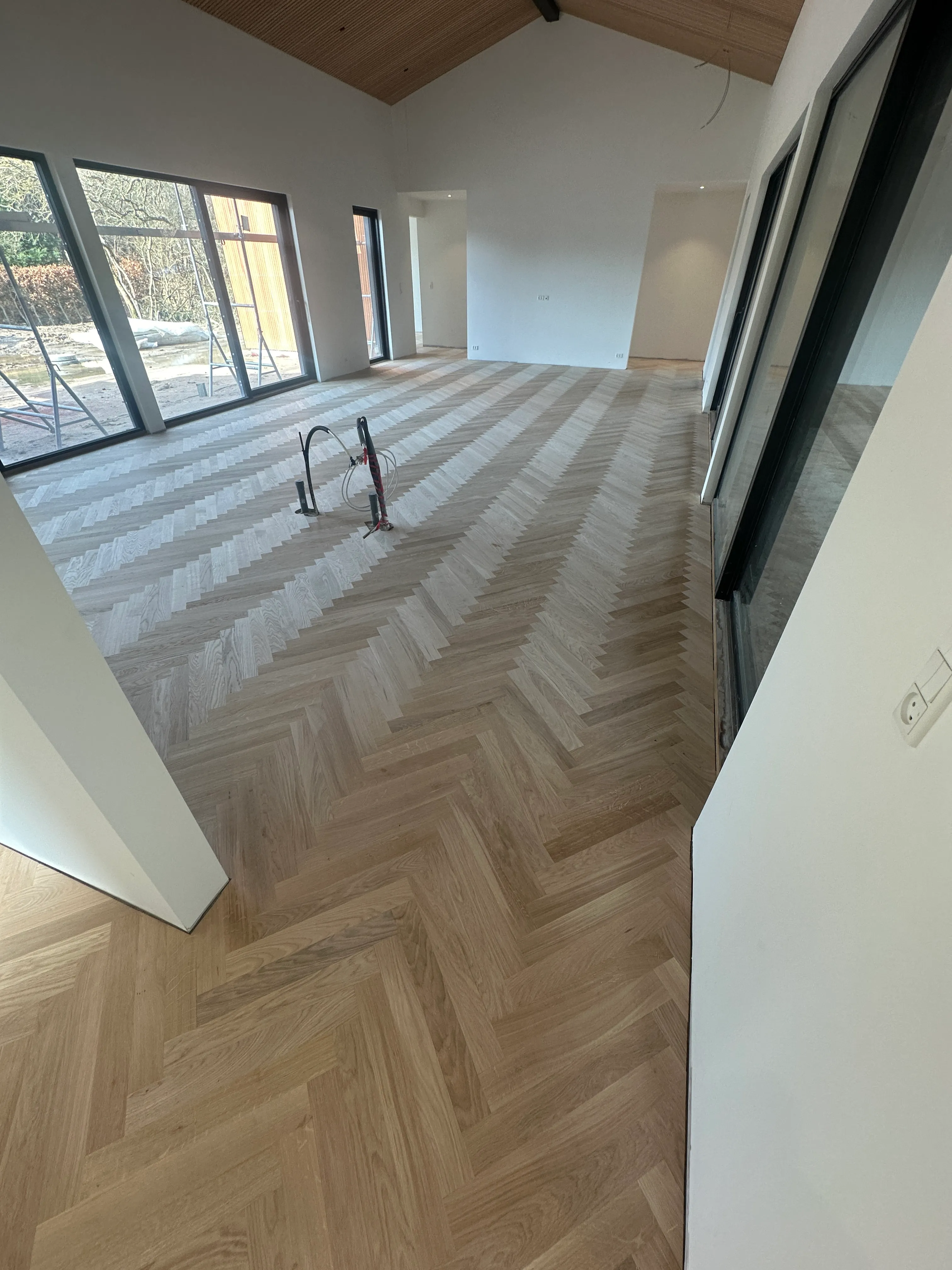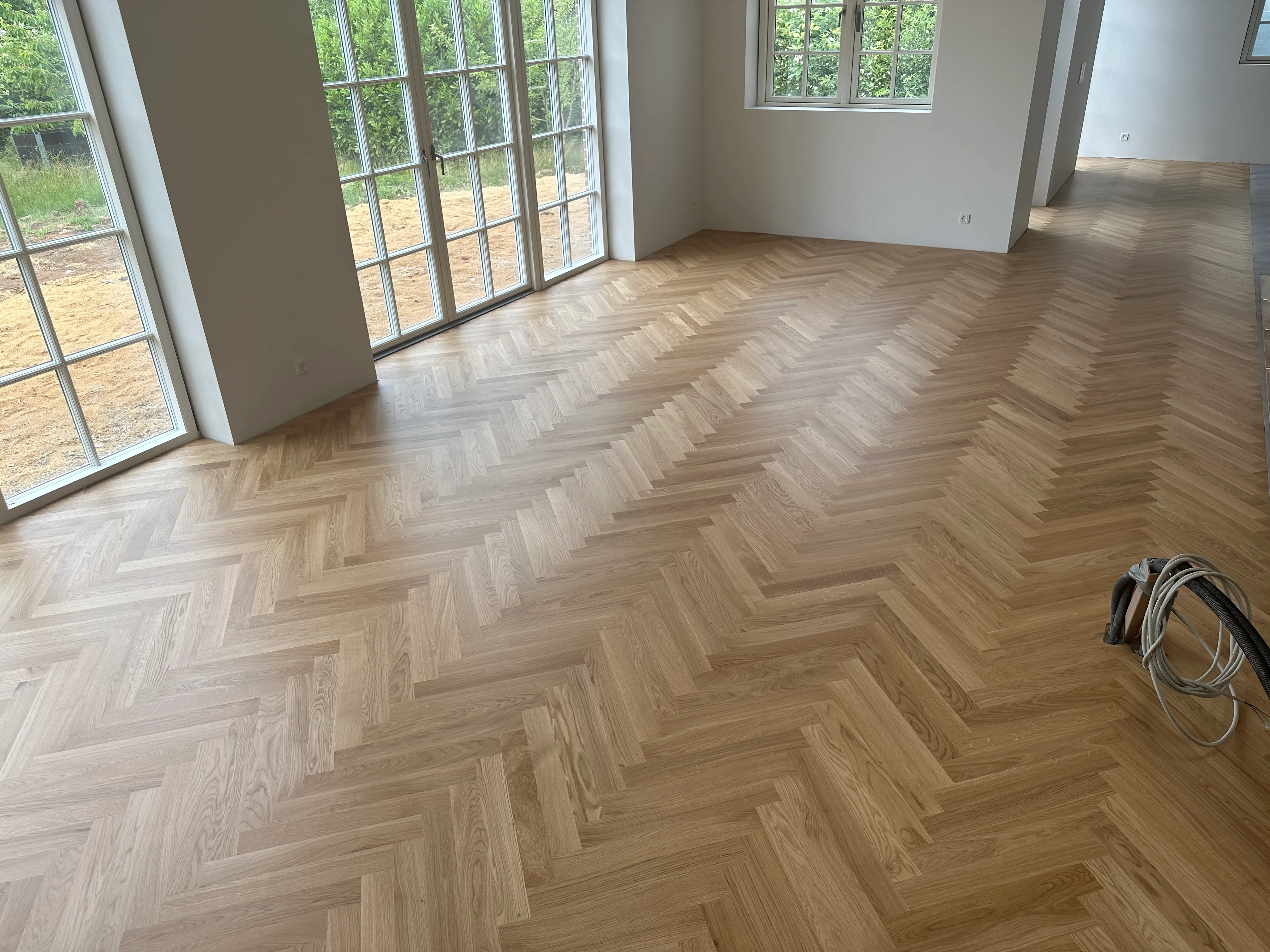 Efter installation kan sildebensparket behandles med forskellige finish-løsninger. Naturlig olie fremhæver træets struktur og er nem at vedligeholde. UV-lakering giver en robust overflade med høj modstandsdygtighed. Hårdvoksolie kombinerer det bedste fra begge verdener. Vi hjælper dig med at vælge den behandling, der passer bedst til dit behov.