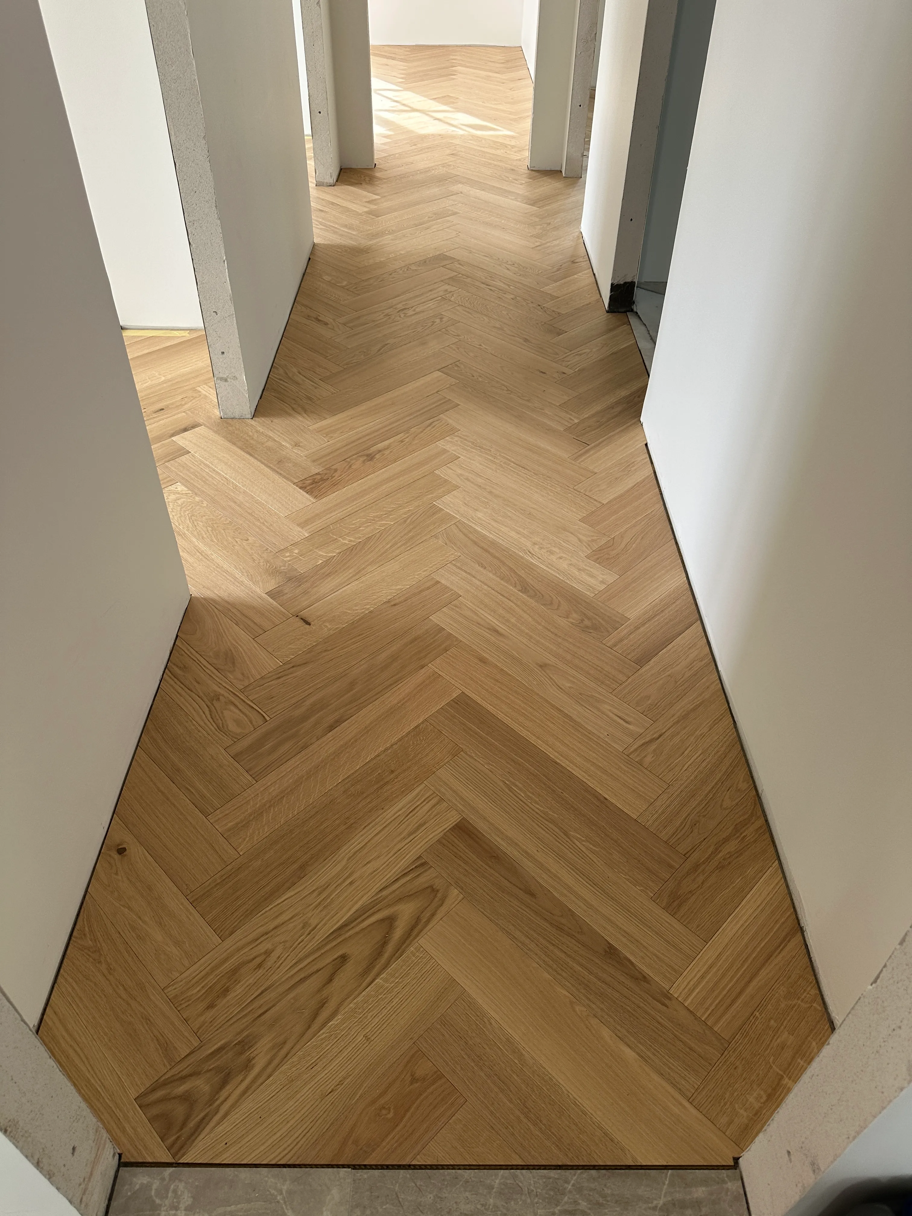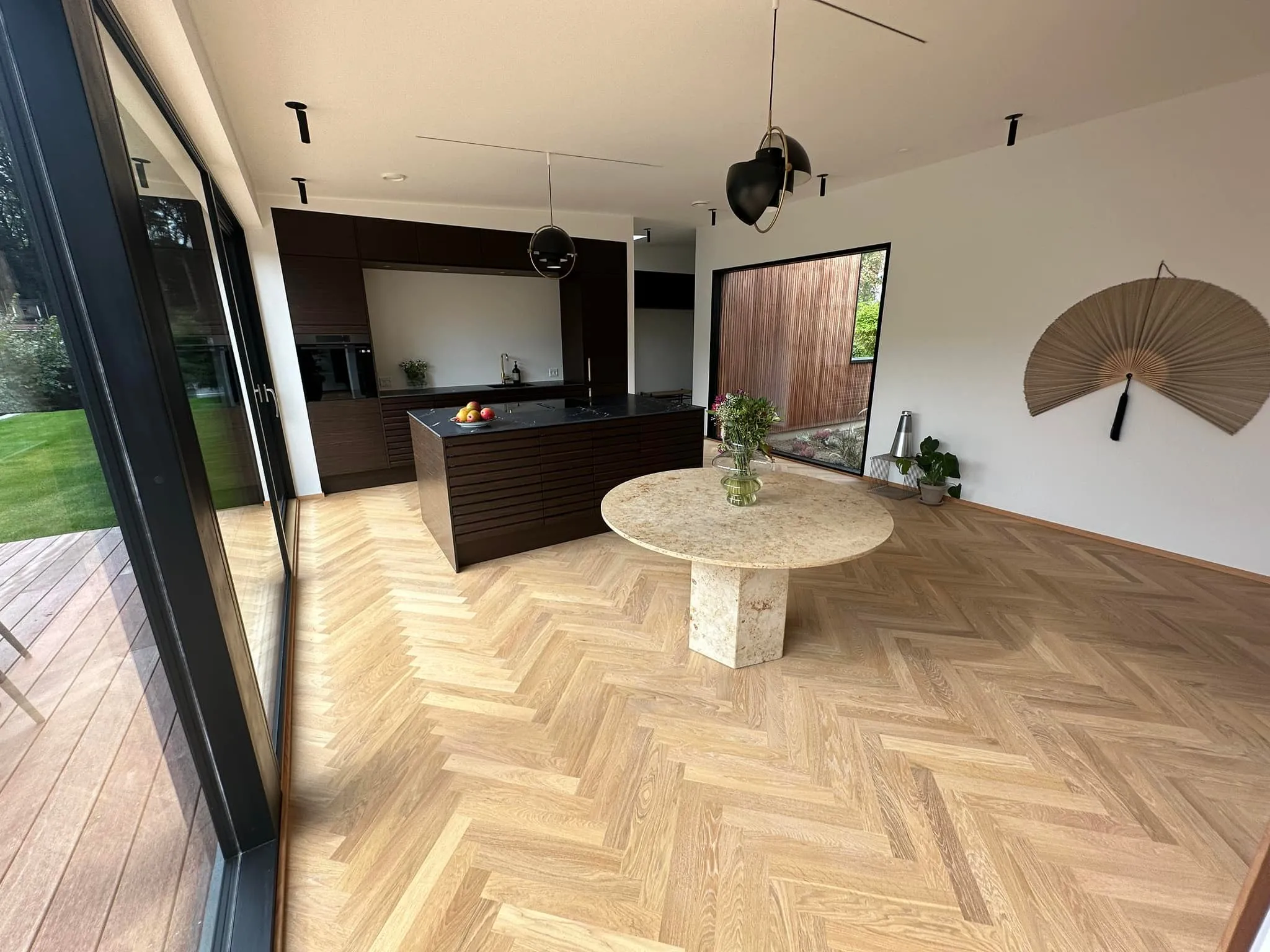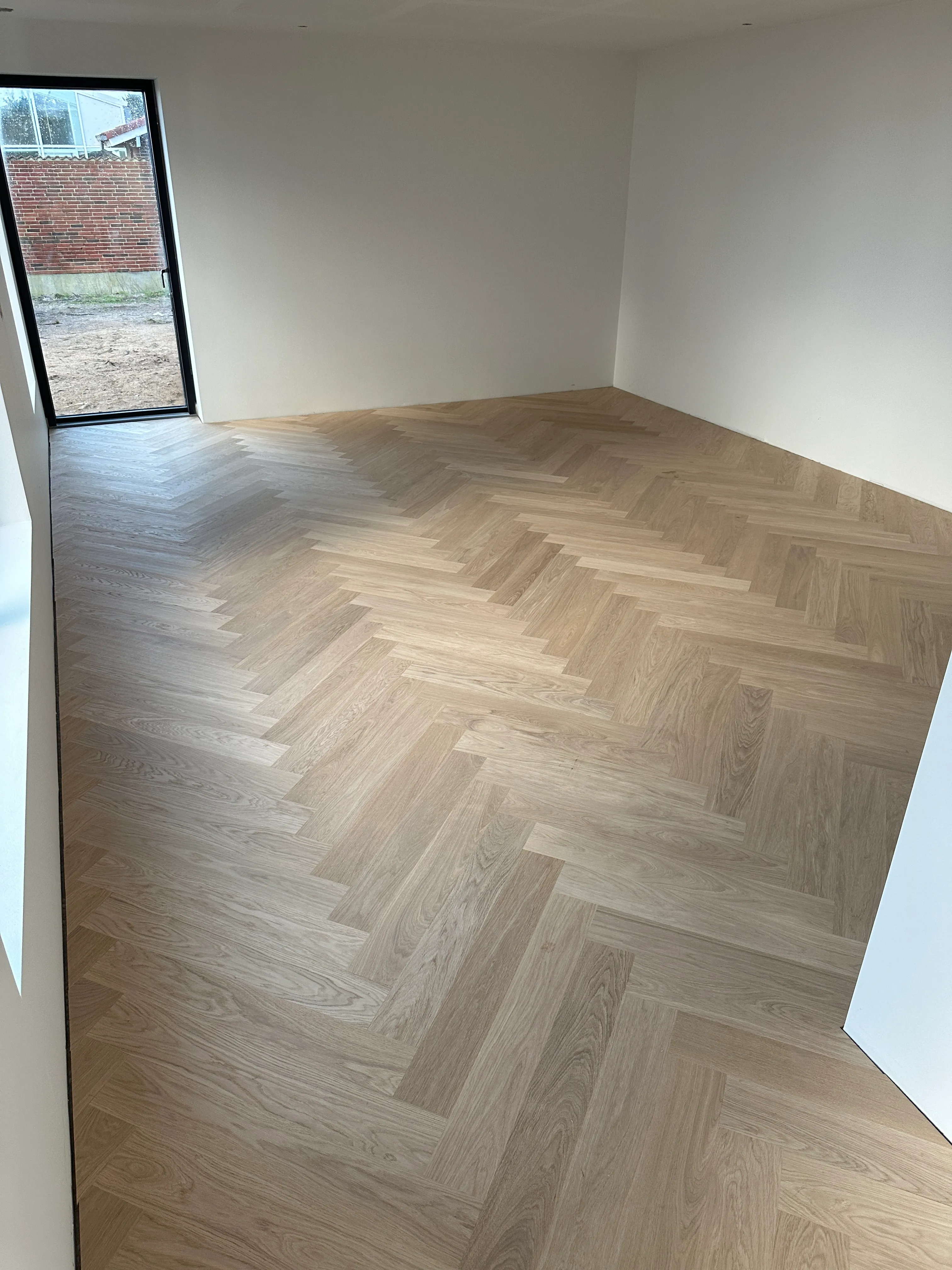 Efter installation kan sildebensparket behandles med forskellige finish-løsninger. Naturlig olie fremhæver træets struktur og er nem at vedligeholde. UV-lakering giver en robust overflade med høj modstandsdygtighed. Hårdvoksolie kombinerer det bedste fra begge verdener. Vi hjælper dig med at vælge den behandling, der passer bedst til dit behov.